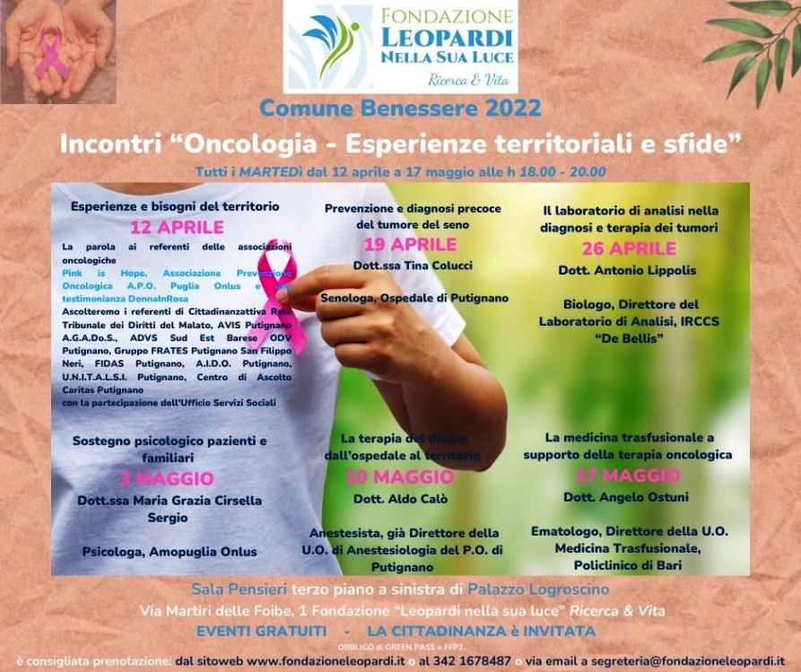 In particolare, il primo appuntamento, il 12 aprile sarà dedicato ad “Esperienze e bisogni del territorio”. La Fondazione Leopardi nella sua Luce diventerà il luogo di incontro e confronto fra le tante realtà socio-sanitarie, associative e del volontariato che operano, instancabili, per dare supporto e sostegno ai malati attuali e potenziali. L’obiettivo è creare una rete di prevenzione e assistenza realmente efficace sul territorio. Parteciperanno all’incontro i referenti delle associazioni oncologiche: Pink is Hope e A.P.O. Associazione Prevenzione Oncologica A.P.O. Puglia Onlus, con la testimonianza di una DonnaInRosa. Inoltre, interverranno, partecipando al confronto, i referenti di: Cittadinanzattiva Rete Tribunale dei Diritti del Malato, AVIS Putignano A.G.A.Do.S., ADVS Sud Est Barese ODV Putignano, Gruppo FRATES Putignano San Filippo Neri, FIDAS Putignano, A.I.D.O. Putignano, U.N.I.T.A.L.S.I. Putignano, Centro di Ascolto Caritas Putignano. L’evento vede il coinvolgimento dell’Ufficio Servizi Sociali di Putignano.