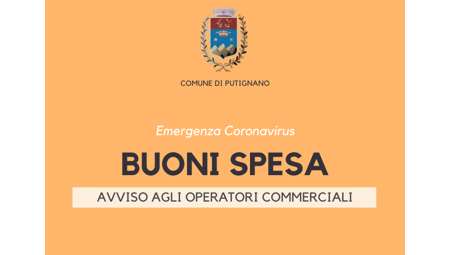 Entro le ore 17:00 di giovedì 11 novembre gli esercenti di attività commerciali (farmacie, parafarmacie, supermercati-discount, negozi di vicinato di prodotti alimentari quali macellerie, pescherie, fruttivendoli, tabaccai, articoli igienico-sanitari) operanti nel Comune di Putignano possono manifestare il proprio interesse a essere inseriti nell’elenco comunale delle attività disponibili ad accettare i buoni spesa emessi dall’Ufficio Servizi Sociali. La manifestazione di interesse va inviata secondo le modalità e attraverso l’apposita modulistica online sul sito web del Comune di Putignano (www.comune.putignano.ba.it). Per informazioni 080.4056407. Seguiranno, nei prossimi giorni, le informazioni rivolte ai cittadini per richiedere i buoni spesa.