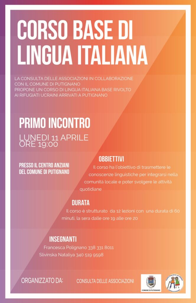 12 incontri (3 a settimana), dalle ore 19:00 alle 20:00 al Centro Anziani di Putignano in via Gianfedele Angelini, al fine di trasmettere le conoscenze linguistiche per integrarsi nella comunità locale e poter svolgere le attività quotidiane. Per tutte le informazioni è possibile contattare le insegnanti Francesca Polignano al 338.3318011 o Slivinska Nataliya al 340.5199598