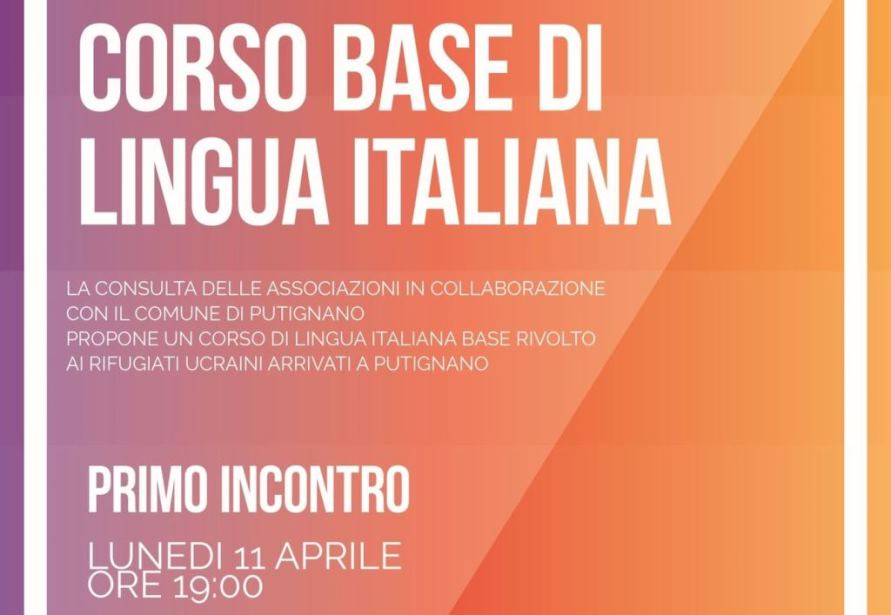 12 incontri (3 a settimana), dalle ore 19:00 alle 20:00 al Centro Anziani di Putignano in via Gianfedele Angelini, al fine di trasmettere le conoscenze linguistiche per integrarsi nella comunità locale e poter svolgere le attività quotidiane. Per tutte le informazioni è possibile contattare le insegnanti Francesca Polignano al 338.3318011 o Slivinska Nataliya al 340.5199598