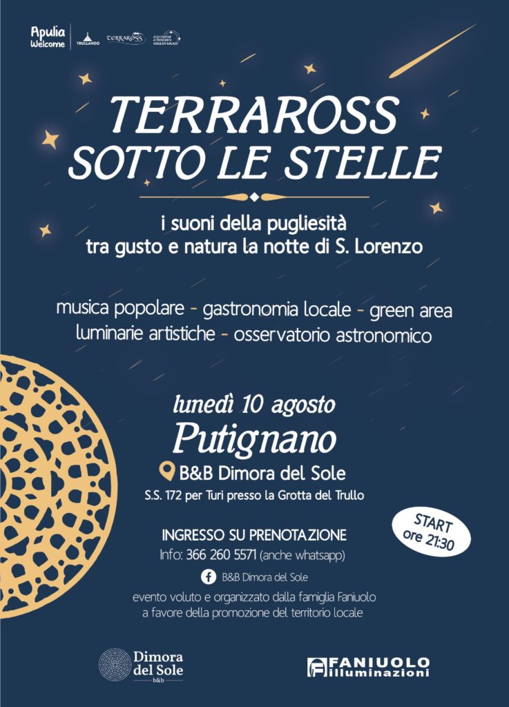 L’evento è organizzato da Apulia Welcome in collaborazione con il B&B Dimora del Sole, Faniuolo Illuminazioni, Trullando, l’associazione astronomica Galileo Galilei.