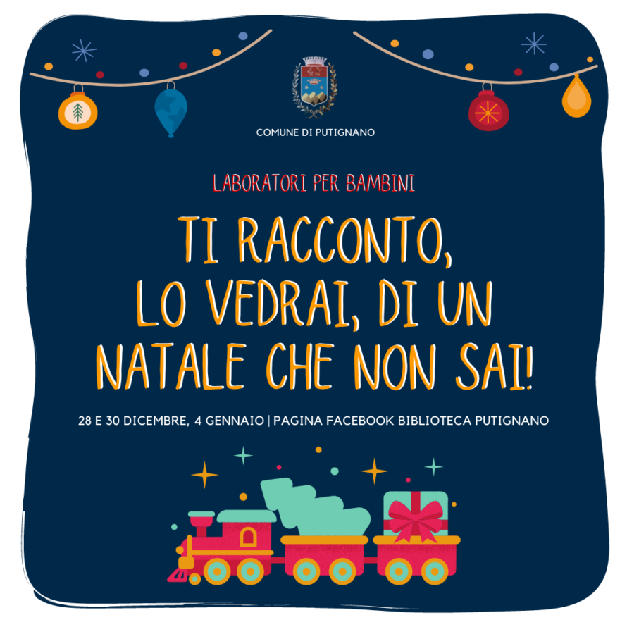 Tre incontri online per scoprire usanze e personaggi di un tempo lontano, attraverso letture animate di racconti natalizi e laboratori pratici. È il progetto “Ti racconto, lo vedrai, di un Natale che non sai”. Tre laboratori, in diretta sulla pagina Facebook della Biblioteca Comunale di Putignano lunedì 28 e mercoledì 30 dicembre 2020 e lunedì 4 gennaio 2021, dalle ore 10:30.