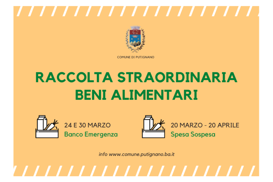 Nelle giornate del 24 e 30 marzo sarà attivo il Banco Emergenza. Dalle ore 9:00 alle ore 12:00 chi vorrà potrà donare pasta, riso, olio, farina, salsa, biscotti, latte, zucchero, sale, pannetti recandosi all’Ufficio Servizi Sociali, sito in via G. Angelini n.26/A. In più, dal 20 marzo al 20 aprile sarà attiva l’iniziativa Spesa Sospesa. Nelle attività commerciali aderenti sarà possibile depositare nel carrello della spesa prodotti da donare alle famiglie putignanesi in difficoltà.