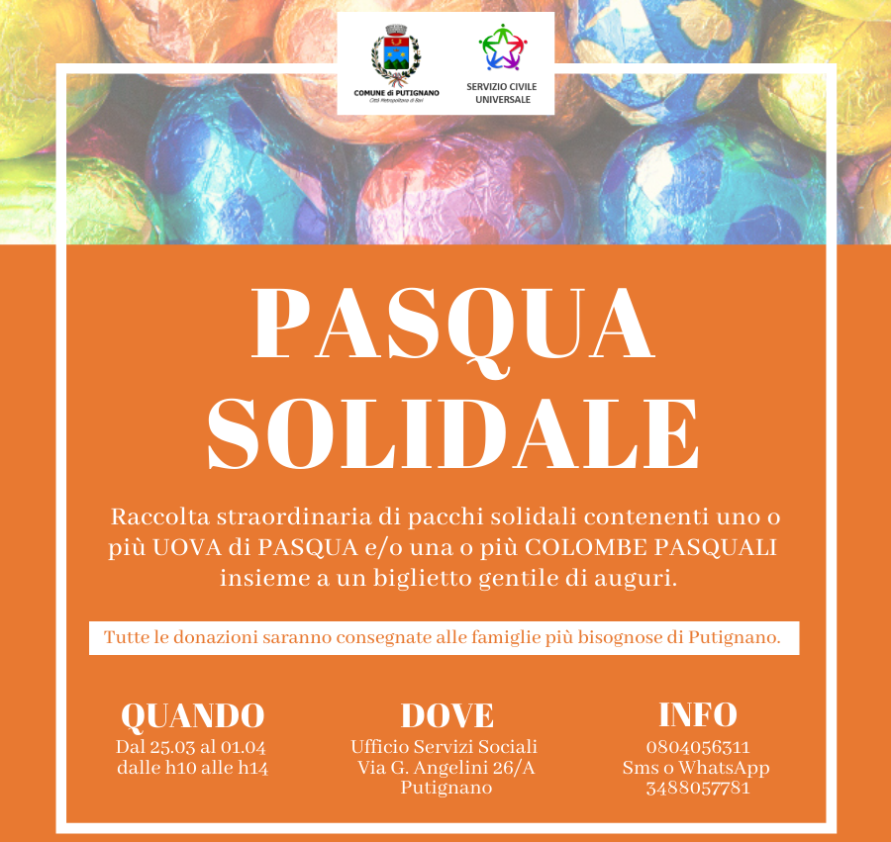 Un piccolo gesto può fare la differenza. L’Assessorato ai Servizi Sociali del Comune di Putignano, con il supporto del Servizio Civile Universale, organizza la raccolta straordinaria di pacchi solidali pasquali da destinare alle famiglie bisognose del territorio, individuate dai Servizi Sociali.