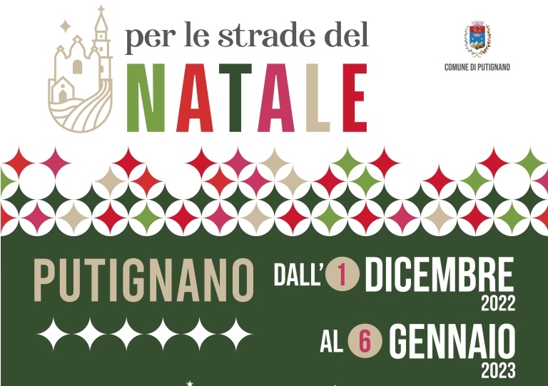 Oltre 70 appuntamenti per grandi e bambini, una suggestiva natività in cartapesta con figure a dimensione umana, il calore e lo scoppiettio dei tradizionali falò di Santa Lucia, Babbo Natale nella sua casetta allestita in Biblioteca, gospel in piazza, concerti gratuiti al Teatro Comunale, appuntamenti con i libri e le arti. Dal 1° dicembre 2022 al 6 gennaio 2023 a Putignano si va “Per le strade del Natale”, il cartellone degli eventi natalizi organizzato dal Comune di Putignano.