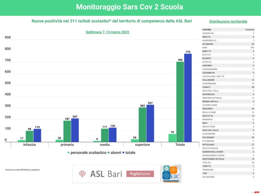 Sono 775 i casi positivi al Sars Cov 2 registrati nell’ultima settimana in ambito scolastico, con un significativo aumento pari al 44% rispetto ai 535 emersi dall’attività di contact tracing dell’Epidemic Intelligence Center della ASL nel periodo compreso fra il 28 febbraio e il 6 marzo. Come conferma il report degli operatori del team Covid Scuole, delle attuali 775 positività nella settimana 7-13 marzo, la maggior parte fa riferimento agli studenti, sono infatti 705, e il resto, 70, al personale docente e non docente.