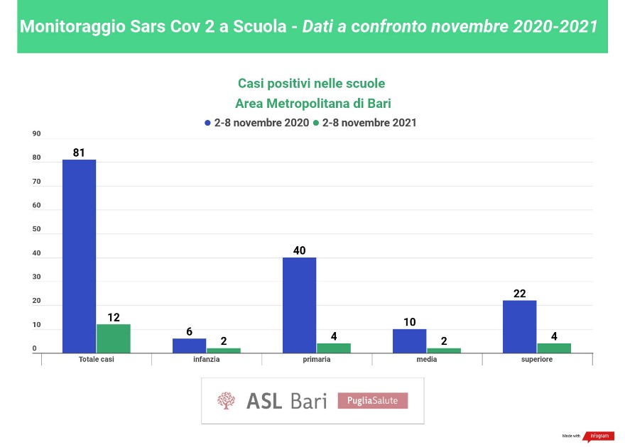 Dal 2 all’8 novembre 2020 erano 81 i casi di positività registrati dalla ASL nelle scuole dell’area metropolitana di Bari. Dal 2 all’8 novembre di quest’anno nella stessa area di riferimento (comuni di Bari, Capurso, Modugno, Triggiano e Valenzano) sono appena 12 i casi monitorati, con un calo dell’85 per cento.