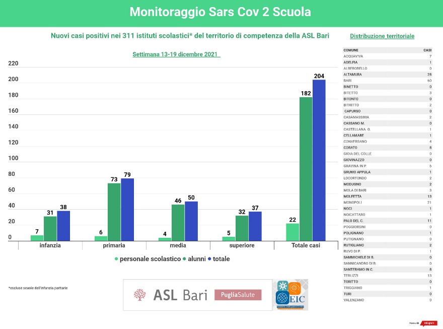 I nuovi positivi sono così distribuiti: 79 nelle scuole primarie, (73 alunni e 6 personale scolastico), 50 nelle scuole secondarie di primo grado (46 alunni e 4 personale scolastico), 38 nelle scuole dell’infanzia (31 alunni e 7 personale scolastico), e infine 37 nelle scuole secondarie di secondo grado (32 alunni e 5 personale scolastico).