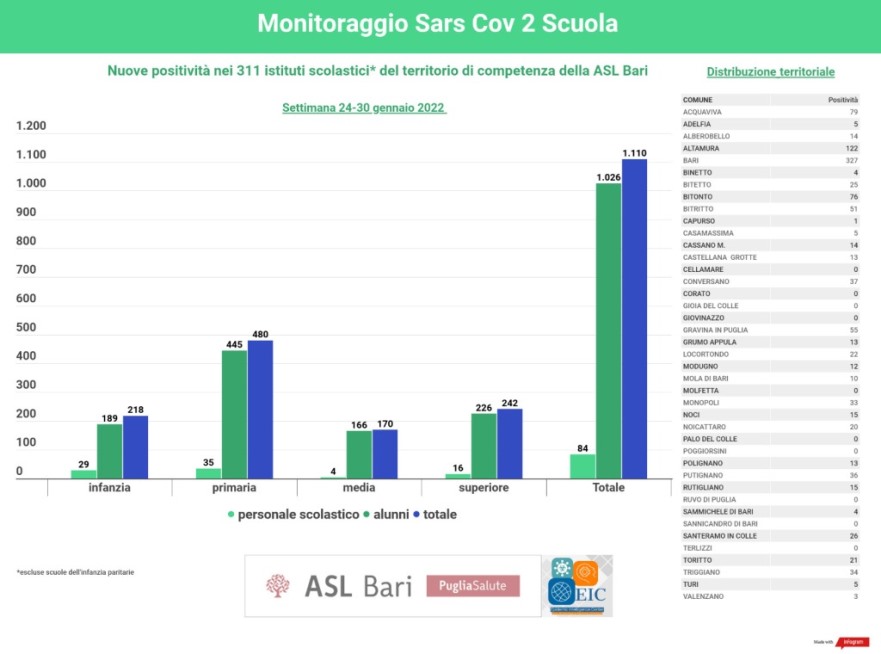 Resta sostenuta la circolazione del virus in ambito scolastico. Lo conferma il numero dei nuovi positivi rintracciati dall’Eic, centrale operativa della sorveglianza sanitaria della ASL: nella settimana fra il 24 e il 30 gennaio sono stati infatti tracciati 1110 casi nelle scuole, ancora in crescita rispetto alle 952 positività della settimana precedente, con la prevalenza dei casi nella scuola primaria.