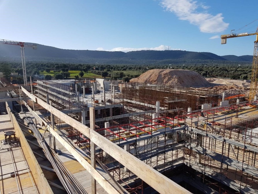Ad oggi sono in fase di conclusione le strutture in cemento armato. Sono invece in corso le lavorazioni architettoniche di chiusura dell’involucro e di tracciamento e posa dei profili degli spazi interni. Procedono in parallelo anche le attività che interessano le aree esterne.