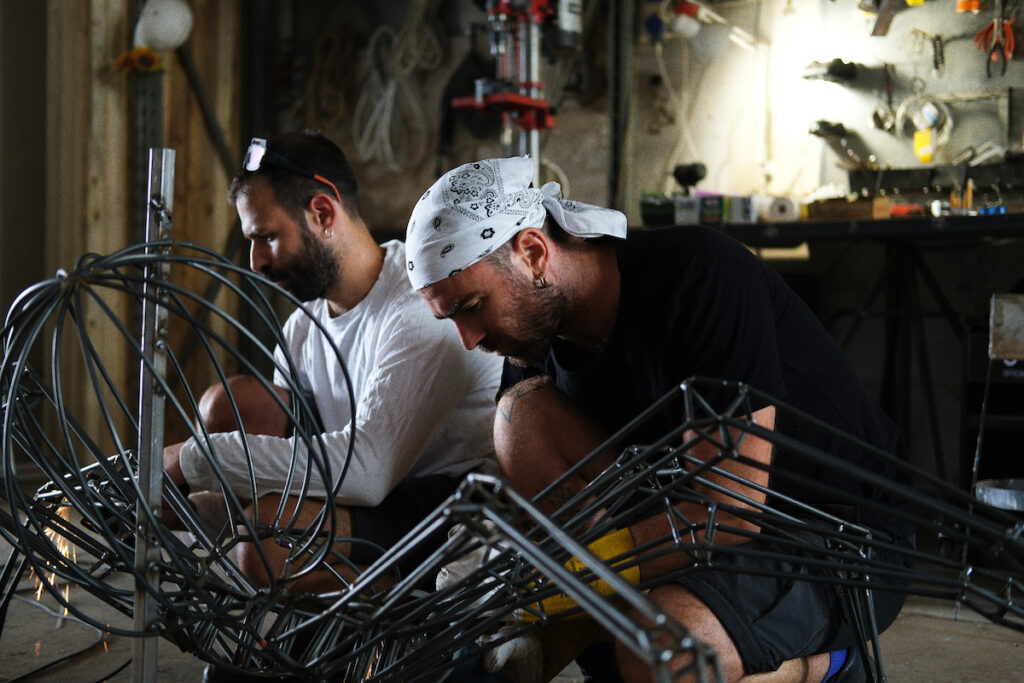 Le sculture in ferro e cartapesta arricchiranno l’esperienza musicale e culturale della Notte della Taranta. La scelta della materialità della cartapesta nella sua mutualità è stata pensata per essere associata alla trasparenza delle pelli dei tamburi che durante la notte suonano fino all’alba. I tre elementi scultorei rappresenteranno delle tarantole e saranno delle vere e proprie luminarie contemporanee che faranno da scenografia alle due postazioni del direttore artistico e visionario produttore internazionale SHABLO affiancato dal maestro e giovanissimo pianista Riccardo Zangirolami.