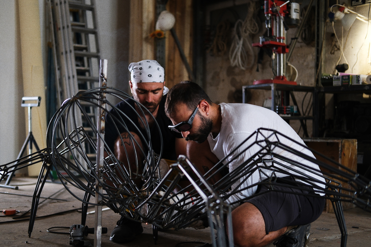 Le sculture in ferro e cartapesta arricchiranno l’esperienza musicale e culturale della Notte della Taranta. La scelta della materialità della cartapesta nella sua mutualità è stata pensata per essere associata alla trasparenza delle pelli dei tamburi che durante la notte suonano fino all’alba. I tre elementi scultorei rappresenteranno delle tarantole e saranno delle vere e proprie luminarie contemporanee che faranno da scenografia alle due postazioni del direttore artistico e visionario produttore internazionale SHABLO affiancato dal maestro e giovanissimo pianista Riccardo Zangirolami.