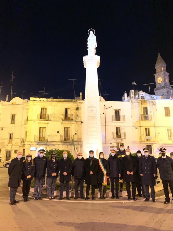 Rinnovato anche quest’anno, seppure in forma ristretta e senza la presenza dell’intera cittadinanza, il rito dell’omaggio floreale alla stele dell’Immacolata, collocata in Largo Porta Nuova. Ieri, come di consueto alle 17, si sono dati appuntamento i parroci della città, la sindaca di Putignano Luciana Laera, nonchè i rappresentanti delle forze dell’ordine, tra cui il vice questore della Polizia di Stato Gerardo Di Munno e la comandante della Polizia locale Maria Teresa Scalini. A guidare la preghiera l’arciprete parroco di San Pietro e vicario zonale don Peppe Recchia che ha affidato alla Vergine Maria la città in questo particolare momento di sofferenza e di contrazione sociale ed economica, a causa della pandemia da Covid-19. Di qui la posa dei cesti di fiori ai piedi della stele da parte dell’amministrazione comunale, della polizia locale e delle quattro comunità parrocchiali. Al termine gli auguri natalizi di don Peppe ai presenti e alla comunità cittadina.